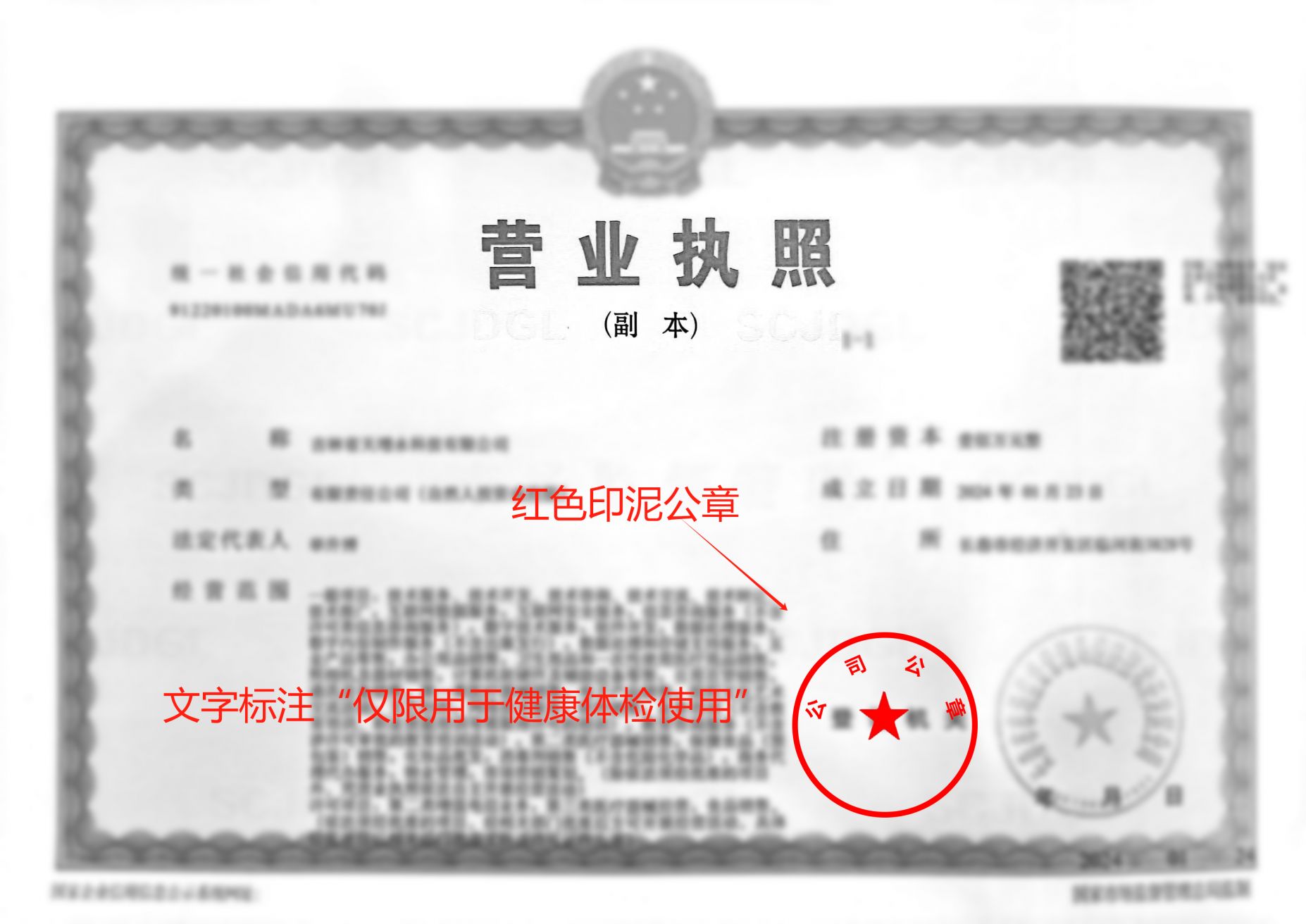 1、用人单位营业执照副本复印件(复印件上加盖“红色印泥公章”、标注“仅限用于健康体检使用”),如下图;