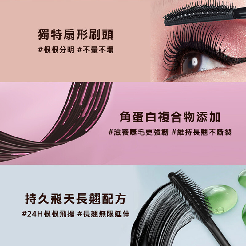 创造炸飞感睫毛的关键,来自的特别成分及刷头。採用独家24H飞天瞬翘科技,膏体轻盈持久长翘,长时间防水不晕妆,搭配轻盈且持久飞天长翘膏体,一刷立即纤长飞翘,使用后睫毛瞬间无限延伸。其中更全新添加角蛋白複合物,擦睫毛的同时让睫毛更强韧捲翘,维持长时间持久根根飞扬!