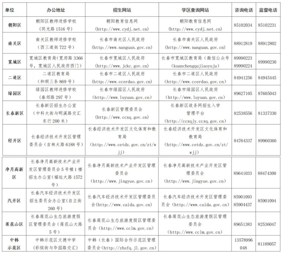 长春市城区2025年义务教育招生相关信息一览表