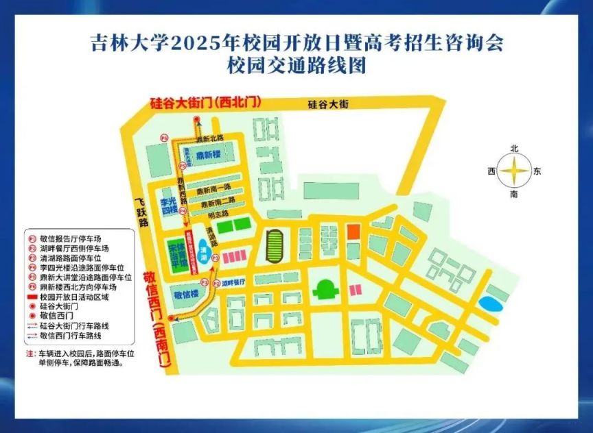 所有校门均面向行人开放,社会车辆请从硅谷大街门(西北门)、敬信西门(西南门)进出校园。社会车辆免费入园时段为活动当天早8时至中午12时。